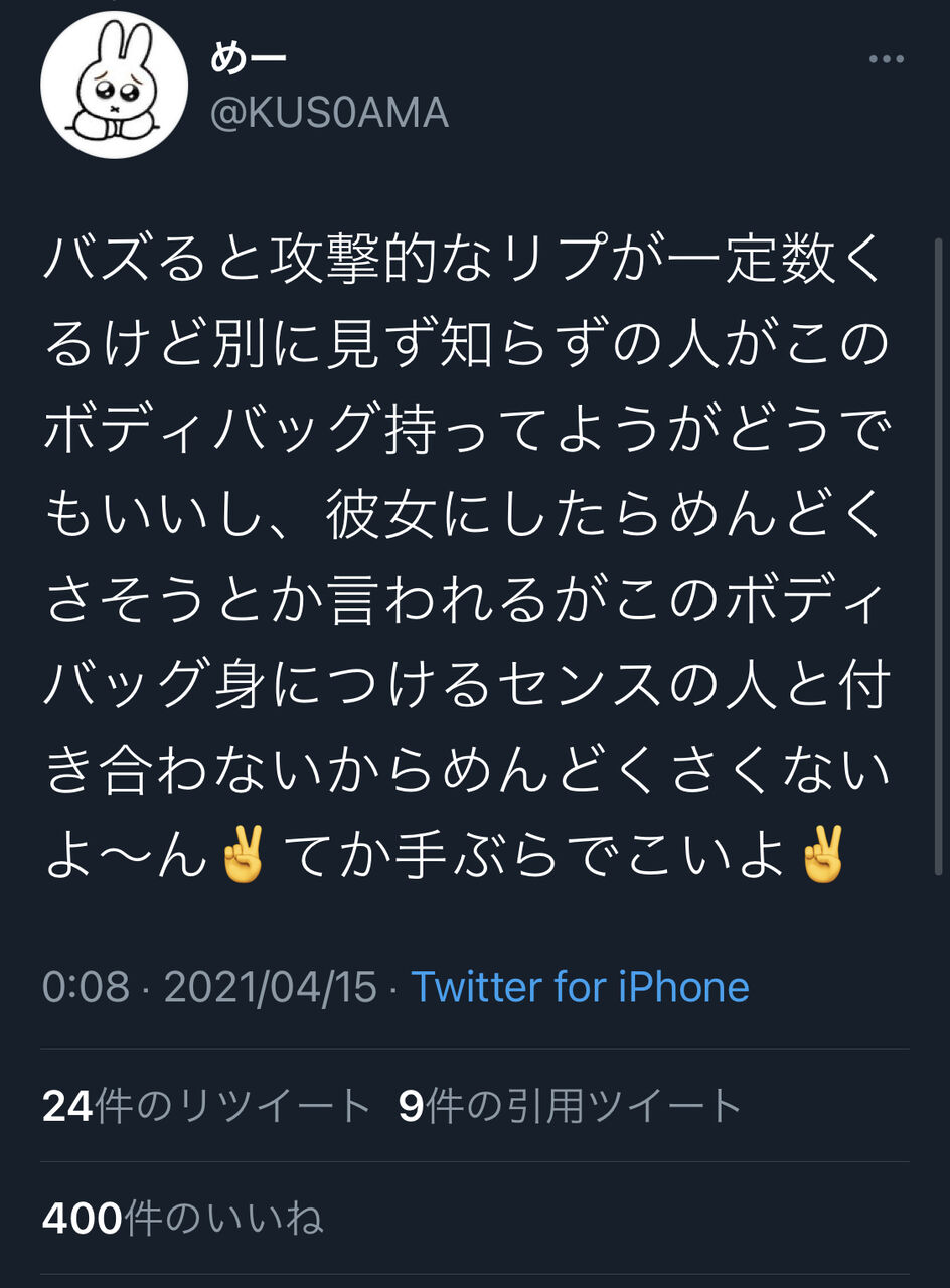 何回も言われてるけどボディバッグがダサいんじゃなくてこの形がダサいんやでもみあげる名無し at 2021年05月01日 17:12 ID:DO5lp3Ao0