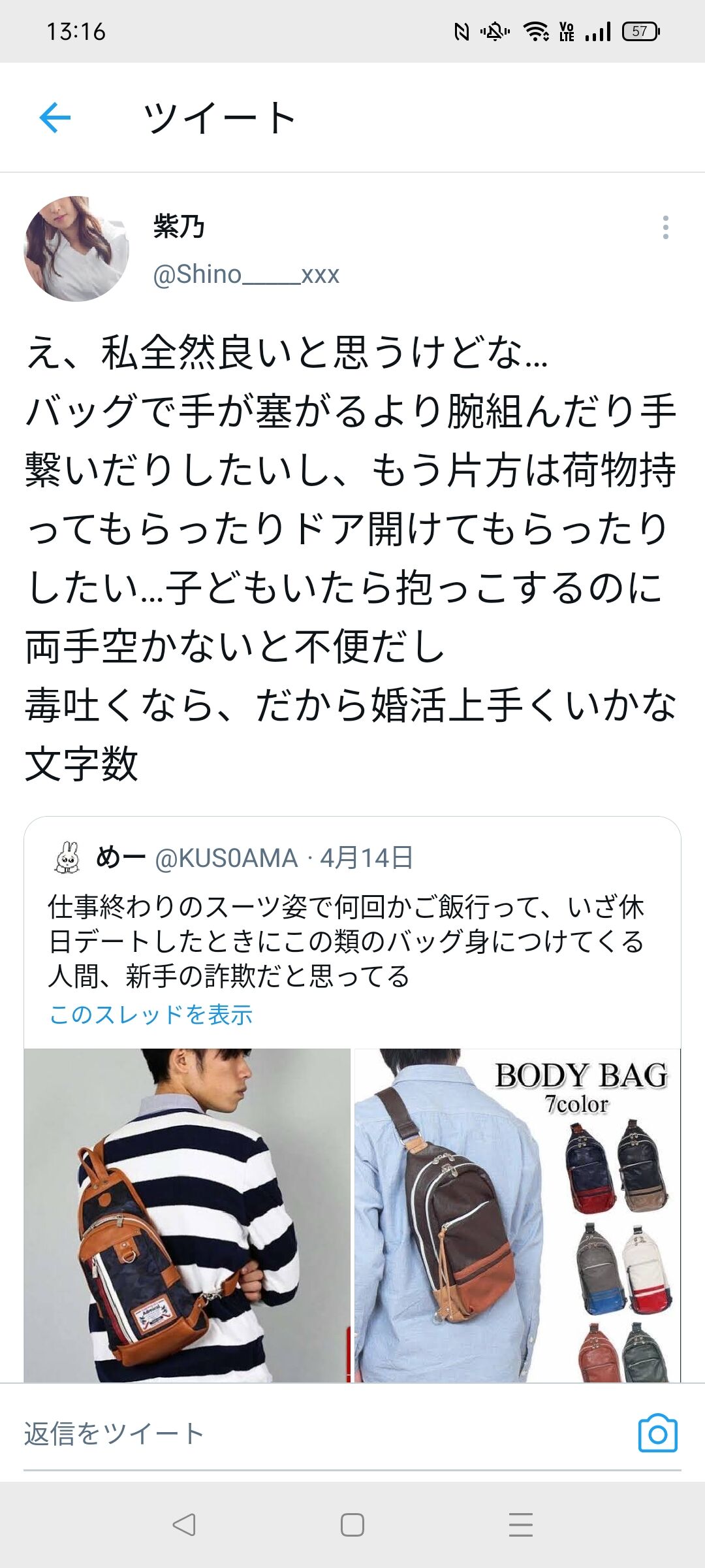 女さん「仕事終わりスーツ姿で何度か会って、いざ休日デートって時にこのバッグで来る男。新手の詐欺だから」