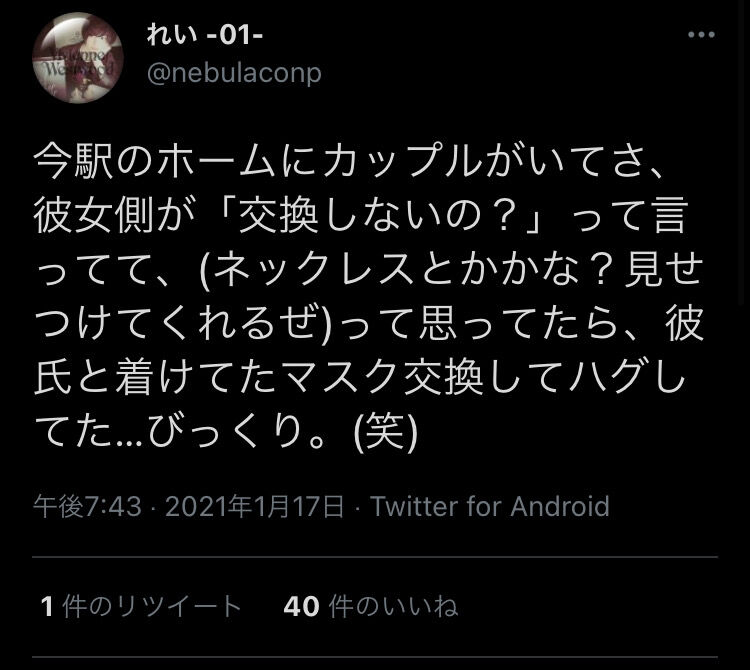 一昔前の若者は好きピとシャツやジャージを交換してたけど最近のトレンドはマスク交換なんだよなぁ