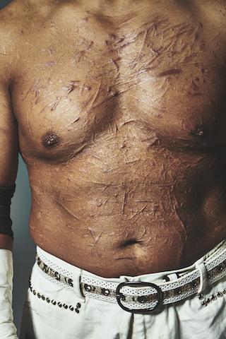 切り裂きプレイというのがあります。カッターや剃刀で体を切るプレイです。そういったプレイでMを演じる人には全身に瑕があります。このプレイは女性で多く見られる自傷行為リストカットに共通するものがあると考えられます。自傷行為はストレスが溜まってどうにも精神の安定が保てないときに、出血を見るとほっとして気分が和らぎます。自傷行為を繰り返す女性は手首から上腕、さらに足、体へと及びます。全身を切り裂く自傷行為をする男性患者を診たこともあります。また見えるところの傷痕は目立ちますので、足の裏を切る女性もいました。