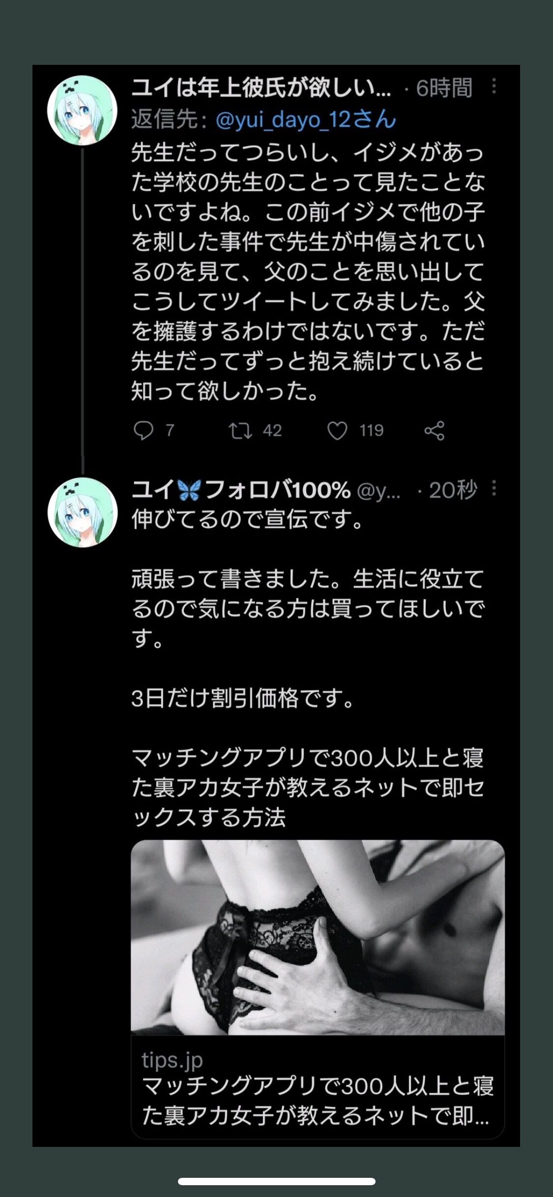 こんな流れで唐突に宣伝されたものを(マッチングアプリ以外だとしても)「おっ、これ使ってみるかな!」ってなるんか…?もみあげるななひ at 2021年12月07日 13:57 ID:sbcRPZFO0