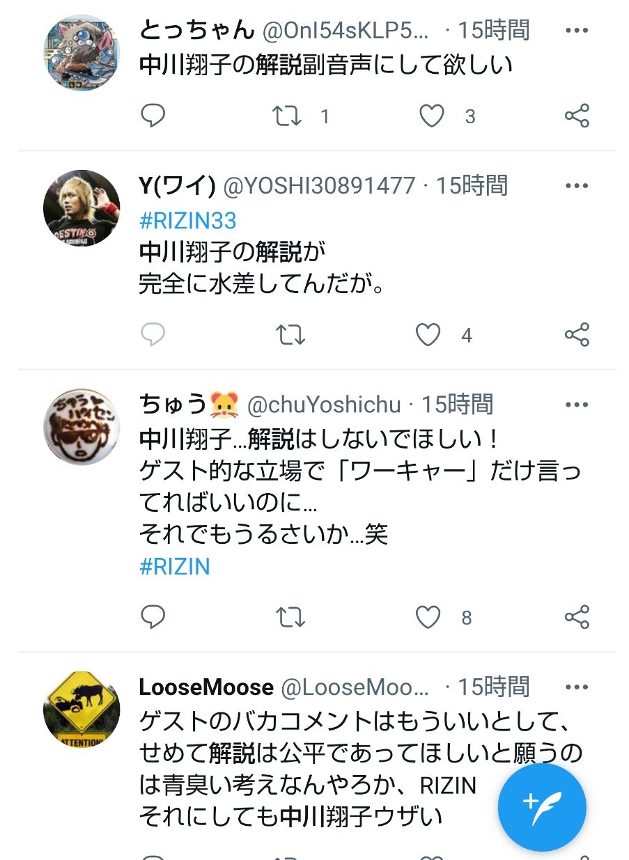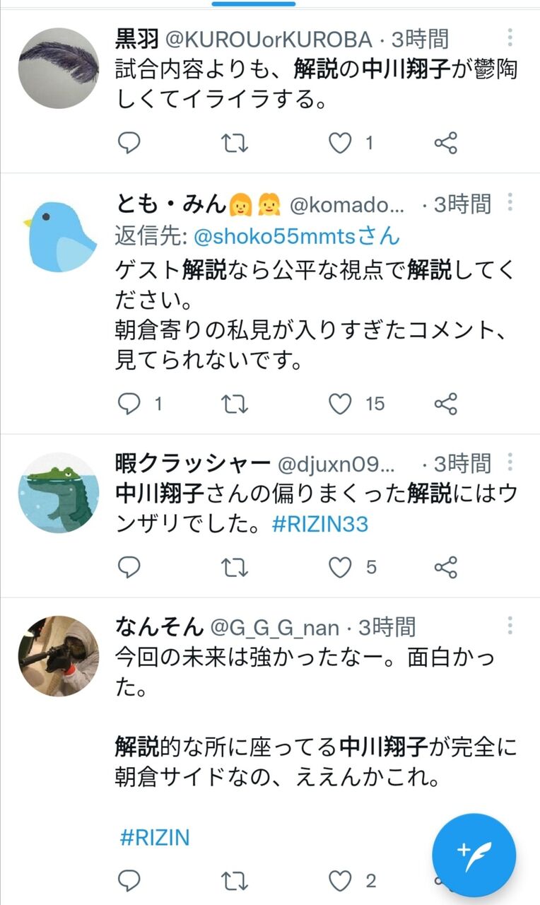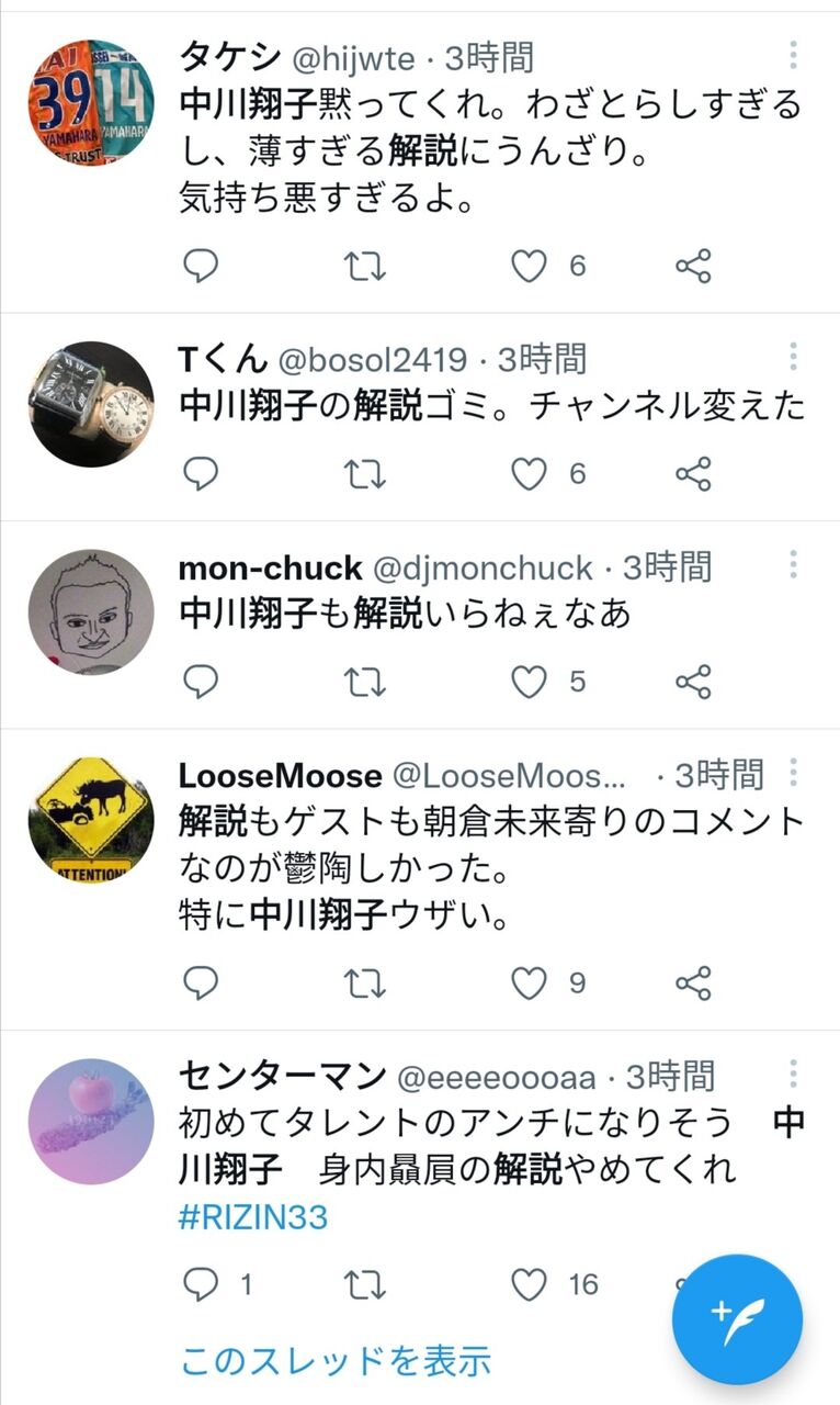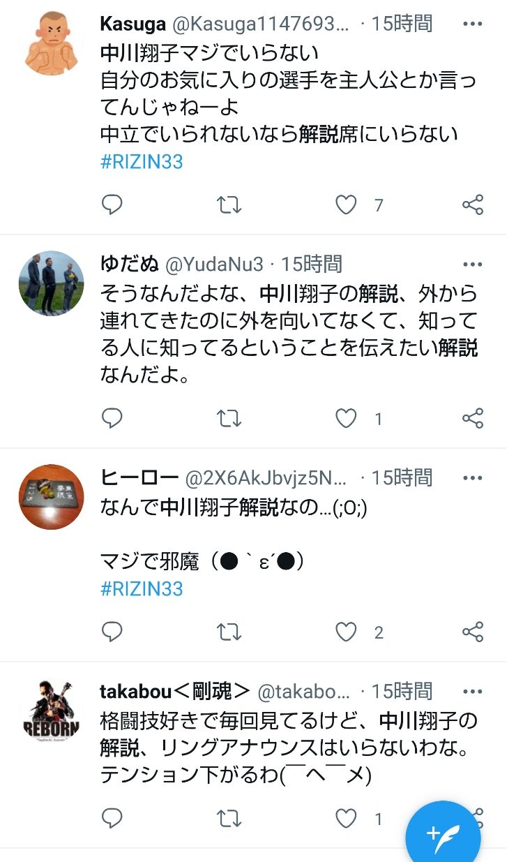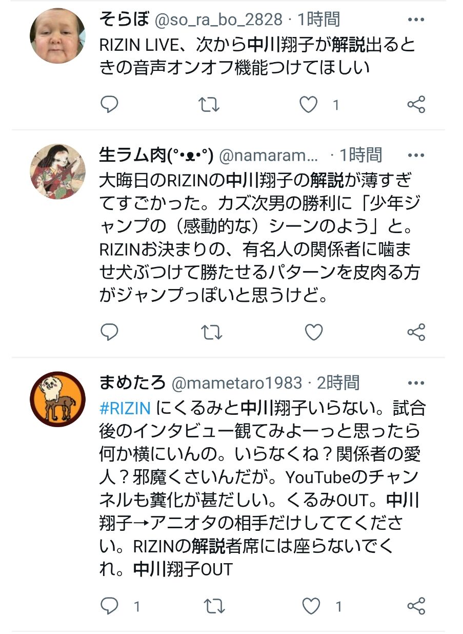 中川は31日、入院の数時間前までRAIZINの実況解説を生放送で務めていたが、朝倉兄弟を贔屓する解説に格闘技ファンから誹謗中傷コメントが噴出していた。