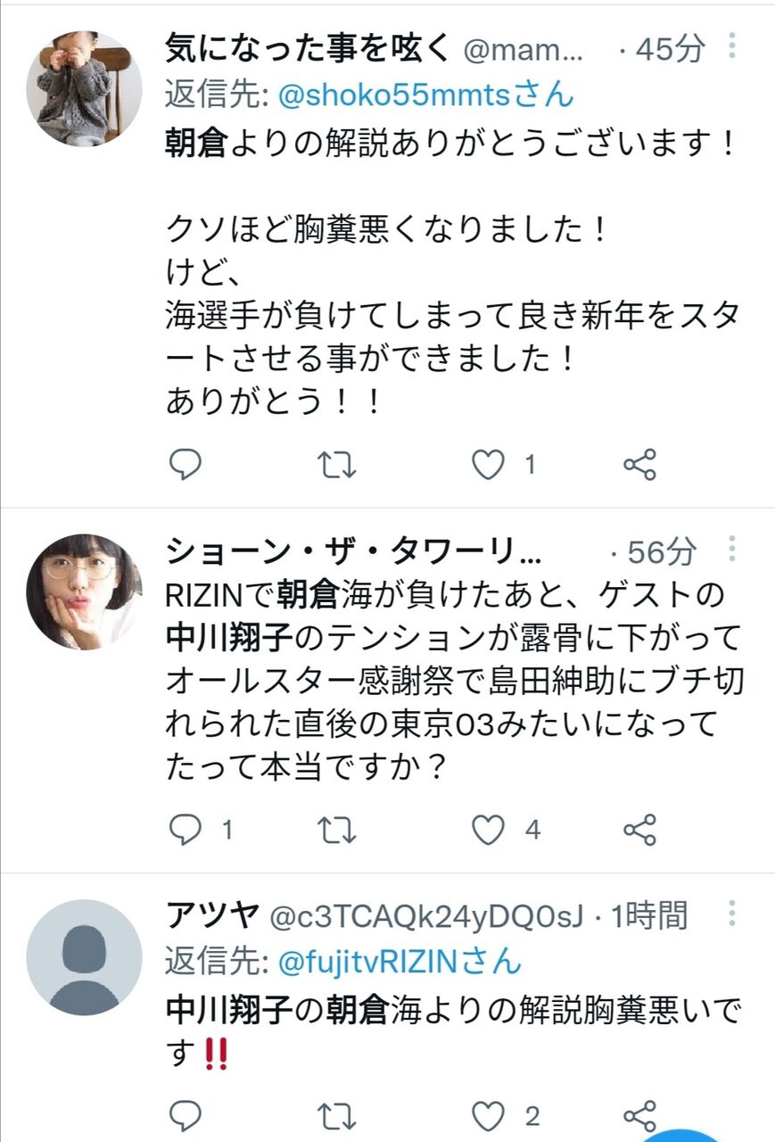 いやRIZINですし... もともと格闘技ファンが見るもんじゃねーでしょもみあげる名無し at 2022年01月01日 19:15 ID:mBfHBRe90