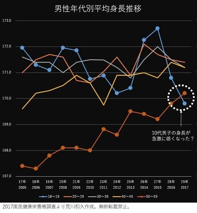 20-40Âå¤ÎÃËÀ¤ÎÊ¿¶Ñ¿ÈĹ¤Ï¡¢¤Û¤Ü170Ѥòͤ¨¤Æ¤¤¤Þ¤¹¡£50Âå¤Ç¤â2017ǯ¤Ë¤Ï¤¸¤á¤Æ170ѤòÆÍÇˤ·¤Þ¤·¤¿¡£¤Ç¤¹¤¬¡¢18-19ºÐÃ˻ҤοÈŤ¬Ä¾¶á2ǯϢ³Äã²¼¤·¡¢170ѤË㤷¤Ê¤¤¤È¤¤¤¦Äã¿ÈĹ²½¤¬¸«¤é¤ì¤Þ¤¹¡£Èùº¹¤Ç¤Ï¤¢¤ê¤Þ¤¹¤¬¡¢50Âå¤Î¤ª¤Ã¤µ¤ó¤Ë10Âå¤Î¼ã¼Ô¤Î¿ÈŤ¬µÕž¤µ¤ì¤¿¤È¤¤¤¦¤³¤È¤Ç¤¹¡£