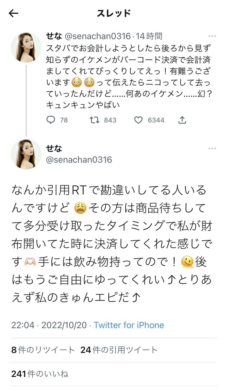 女さん「スタバで会計しようとしたら見知らぬイケメンが払ってくれた。キュンキュンやばい」