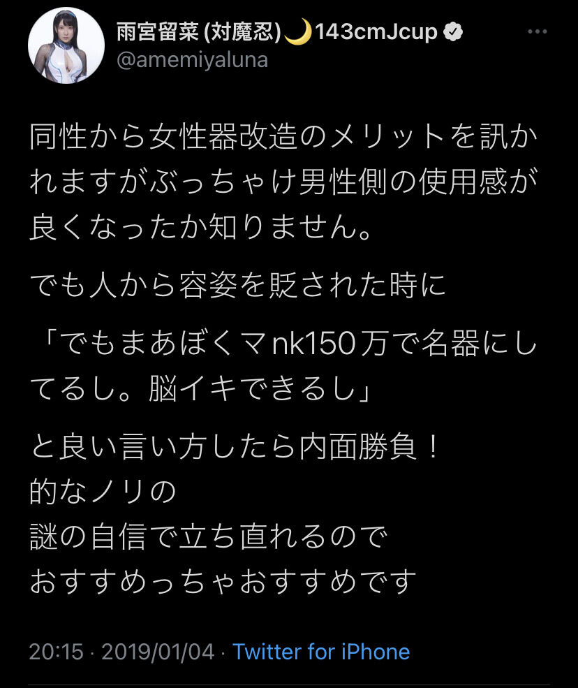 ぶちぶち〜!と打ってイボ作ったの」とTwitter上に記述。女性器を「名器」にするための施術だったようだ。