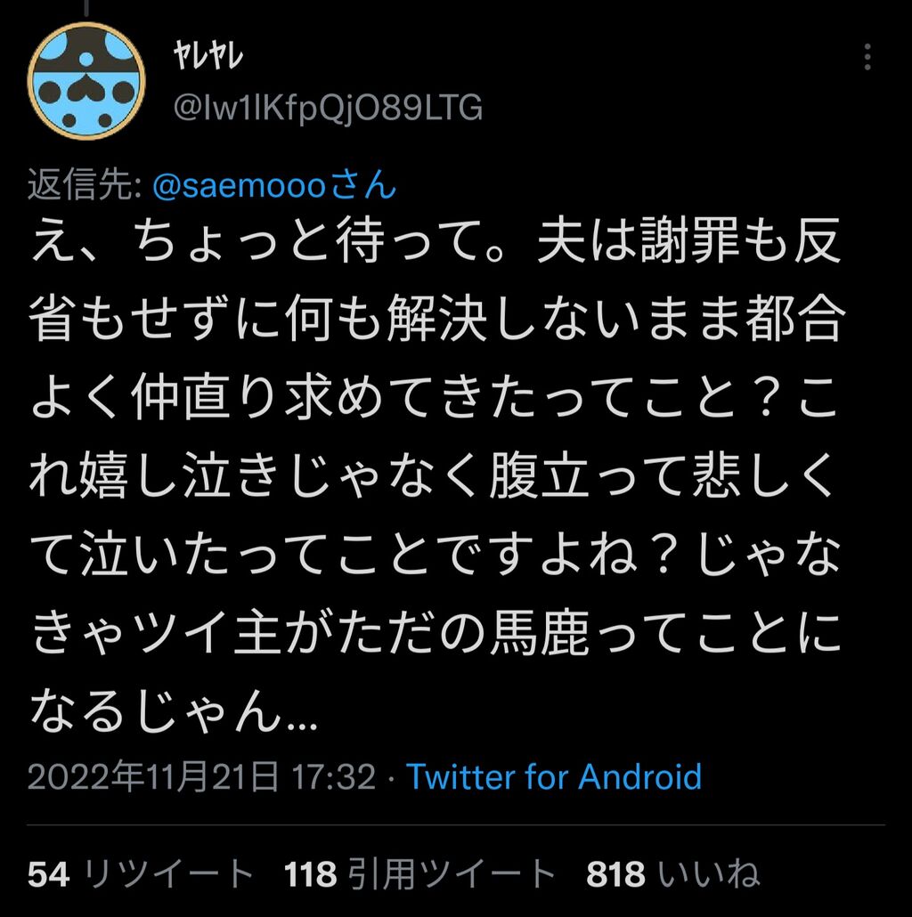 ツイート元の旦那も妻もアタオカすぎるわat 2022年11月24日 01:10 ID:czGo1ucq0 -