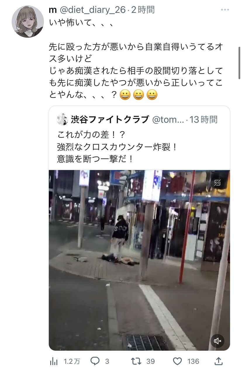 喧嘩を止めるのもリスクはあるよね。殆どの人は殴り合いの経験はない時代だから男相手なら助けられないね。at 2023年01月13日 07:21 ID:aT5aYK5z0 -