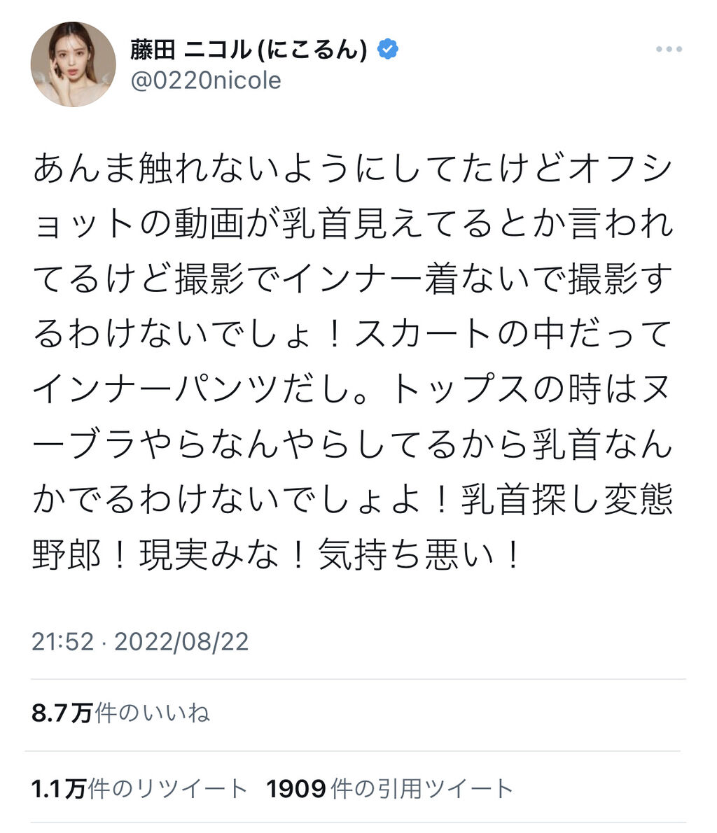 ニューハーフと空目してお股にお得なモノぶら下げてんのかと思って来てみたら藤田ニコルでガッカリだわ…名無し at 2023年01月18日 21:38 ID:GsNxh8jf0