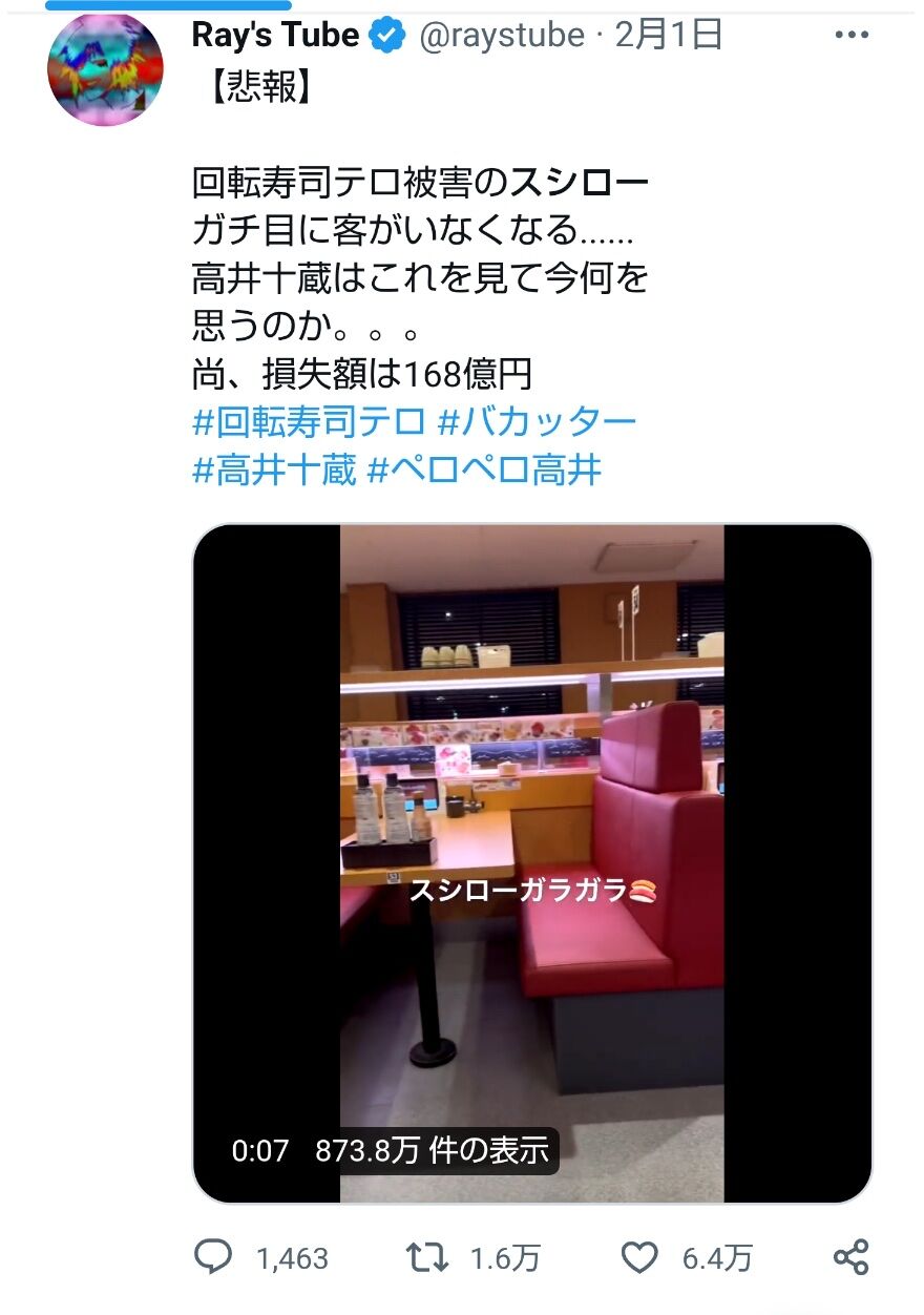しばらく回転寿司もファミレスも行けないもみあげる名無し at 2023年02月06日 08:58 ID:vrgmPSPA0 -