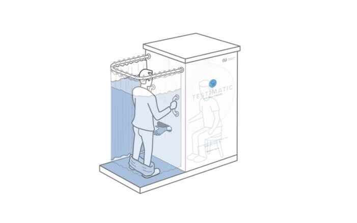 実はこれ、睾丸に異常がないかどうかをチェックしてくれる、世界初の『睾丸チェッカー』。ブースに立ってカーテンを引き、ズボンを下すと、穴から泌尿器科医師の手がニョキリ。実際に睾丸を触診して異常がないか診断してくれます。