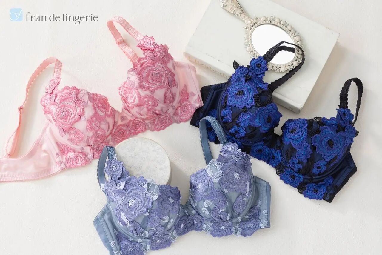 刺しゅう糸やパーツのカラーなど餅田さんが“ときめく組み合わせ”を選んだ、コラボ限定カラーはグレイッシュブルー、ピンク、ブラックの3色。そろいのショーツやスリップなども3Lまでのコラボ限定サイズがある。