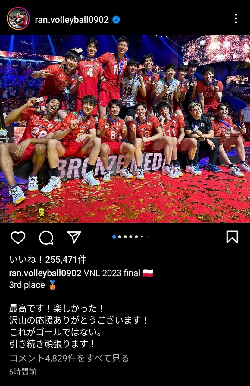 世界のトップ16チームによるバレーボール最強国決定戦、ネーションズリーグ男子大会3位決定戦で、イタリアにフルセットの末勝利し、前身のワールドリーグを通して大会初の銅メダルを獲得した日本代表。1977年のワールドカップで銀メダルを獲得して以来、世界大会(五輪、世界バレー、ワールドカップ、ネーションズリーグ)で表彰台にあがるのは、実に46年ぶりの快挙。