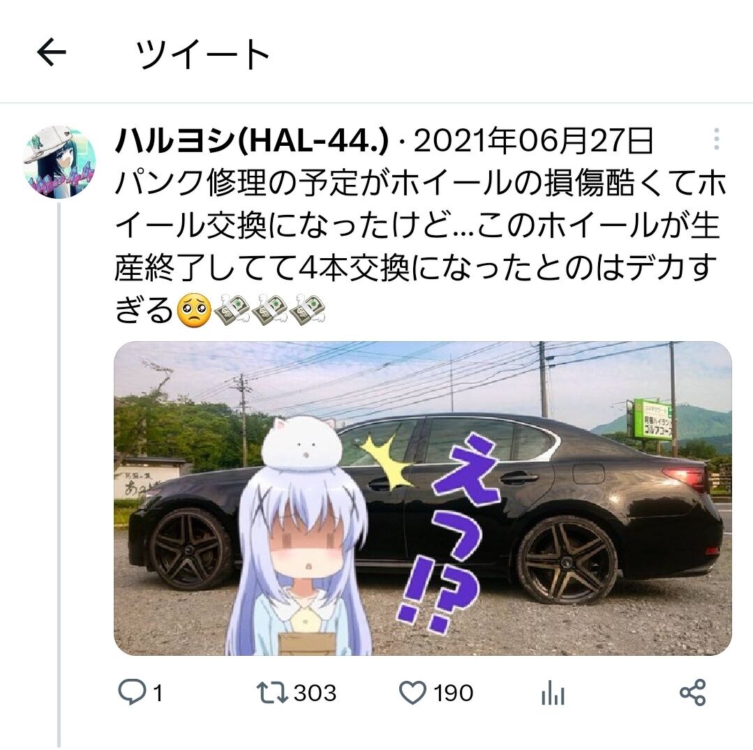 Twitterであげた奴は保険でタイヤ新品になってホイールは自腹でしょ。あ at 2023年07月31日 17:16 ID:CTzwxOli0 -