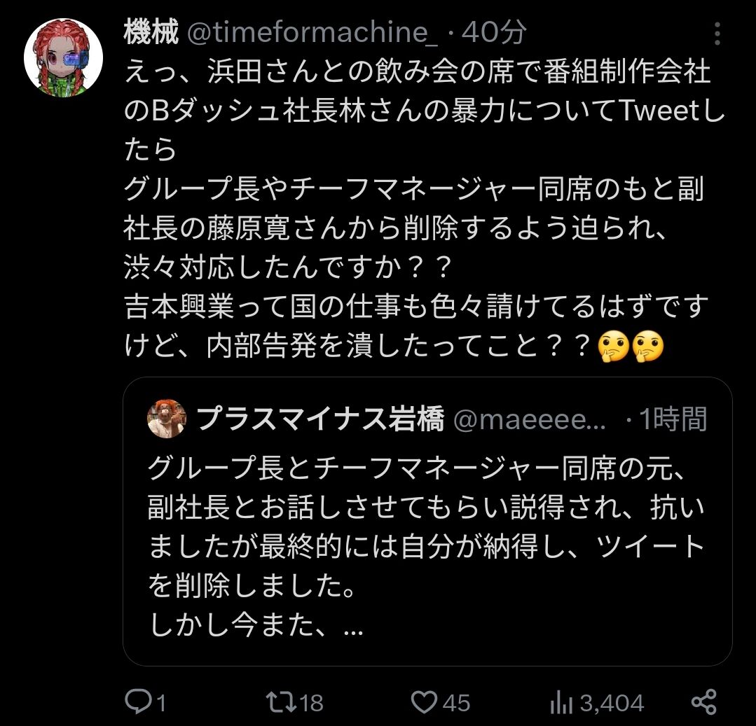 【悲報】プラスマイナス岩橋のパワハラ告発、吉本興業の幹部に揉み消される