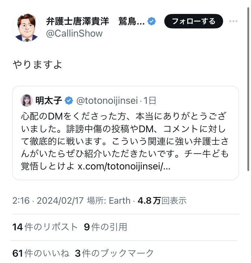 「弁護士おぢが付いてるから強気なんだろ」って言ってた奴ビンゴあ at 2024年02月18日 01:06 ID:MRc1ccHz0