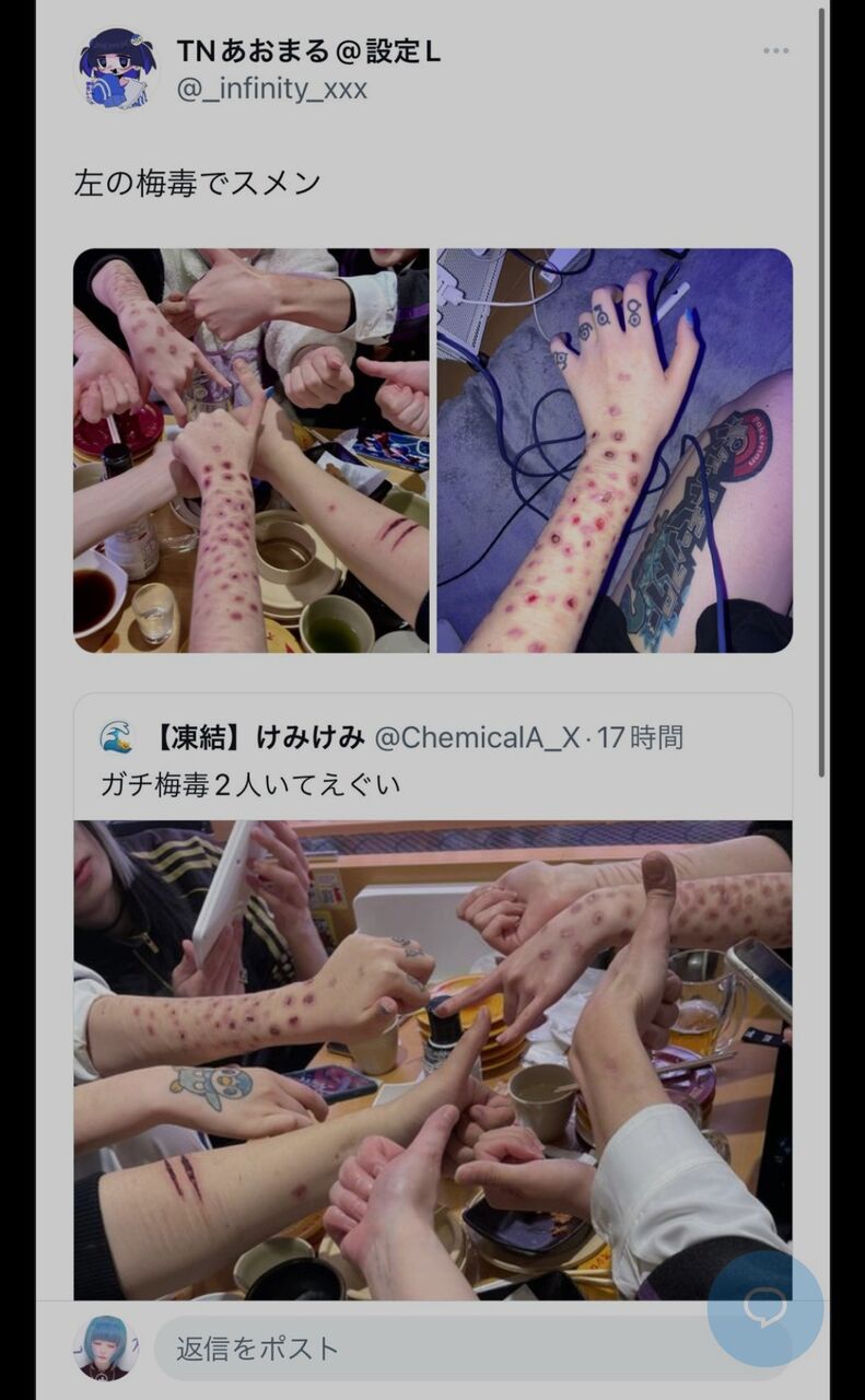 梅毒ってこんなんなるんか蓮コラみたいでキモいなもみあげる名無し at 2024年02月26日 20:20 ID:pNKiXH930