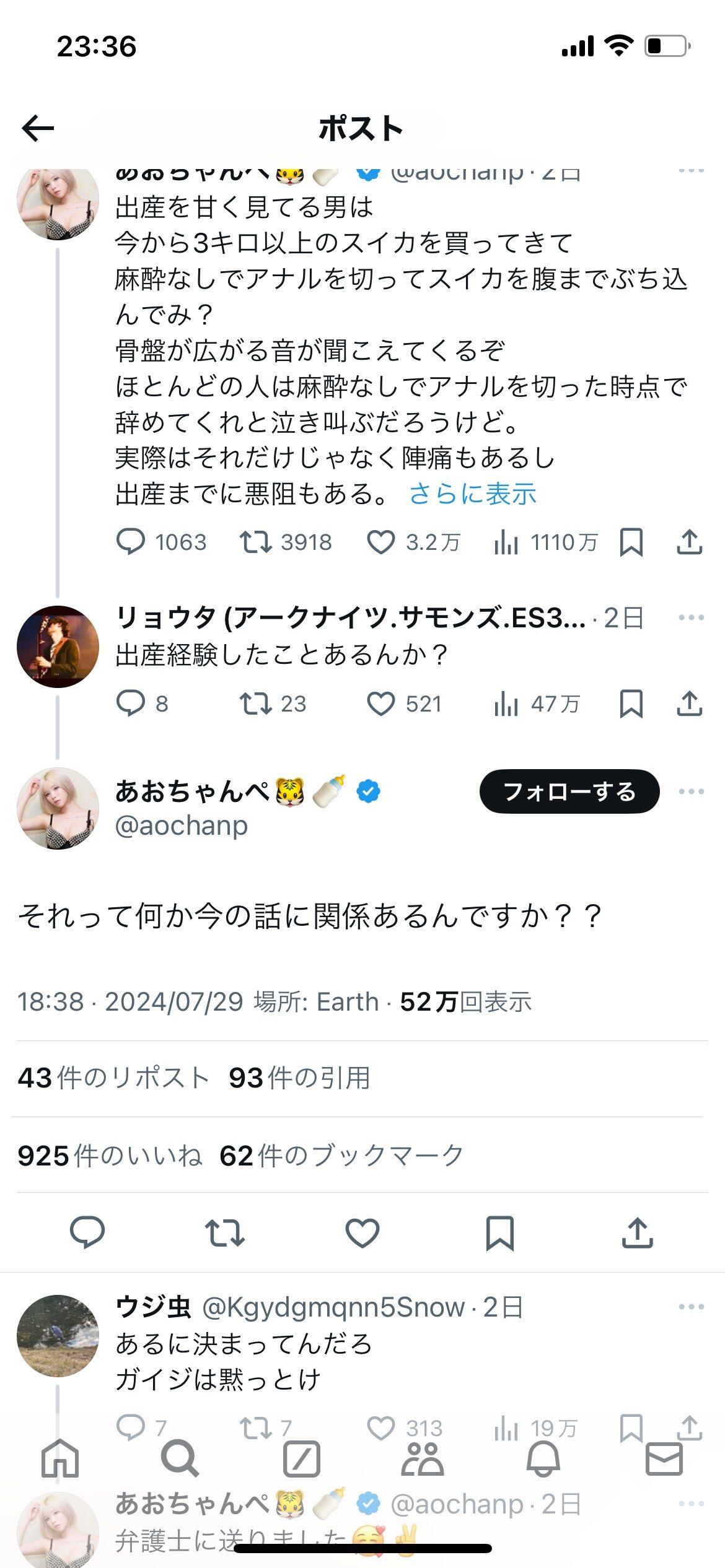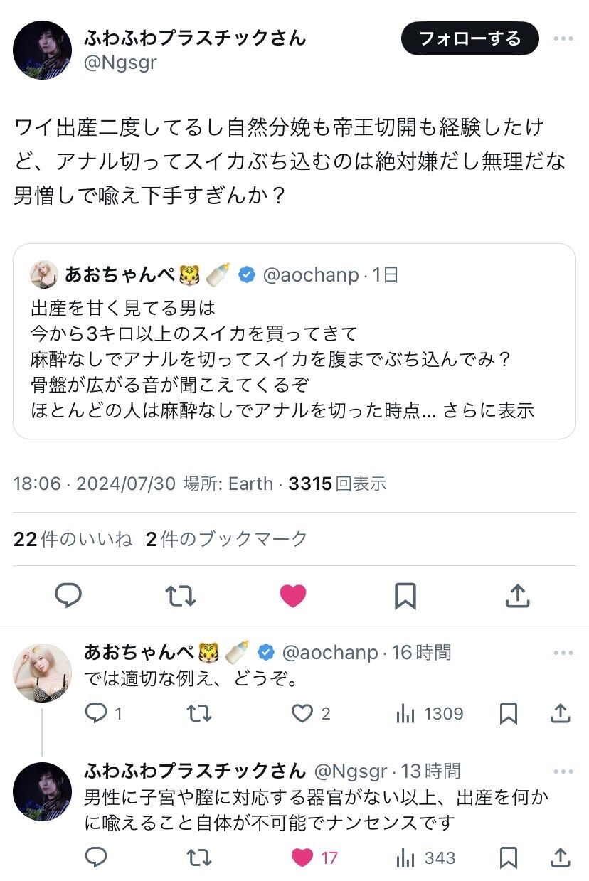 でもこいつ出産経験ないんだよね。そして出産経験あるやつ絡まれてにボロ負けして逆ギレしてたat 2024年08月03日 12:31 ID:I9zi4S4J0