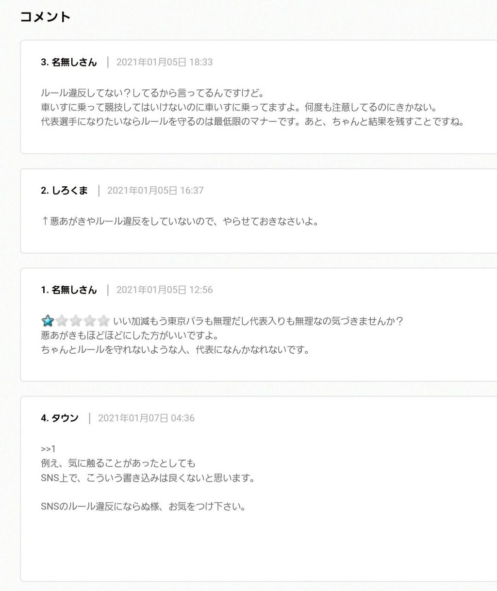 その選手が、ルール違反をしていると思っていたので、書き込みをしました。しかし、その選手は、国内外の大会で、ルール違反等の処分を受けた事はありません。