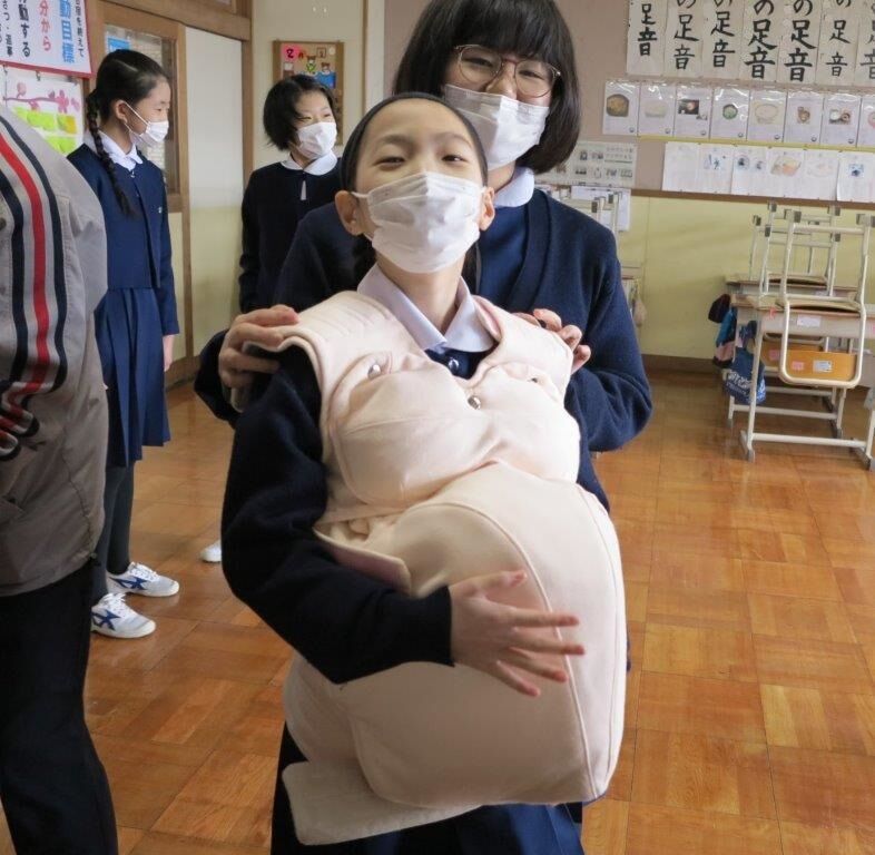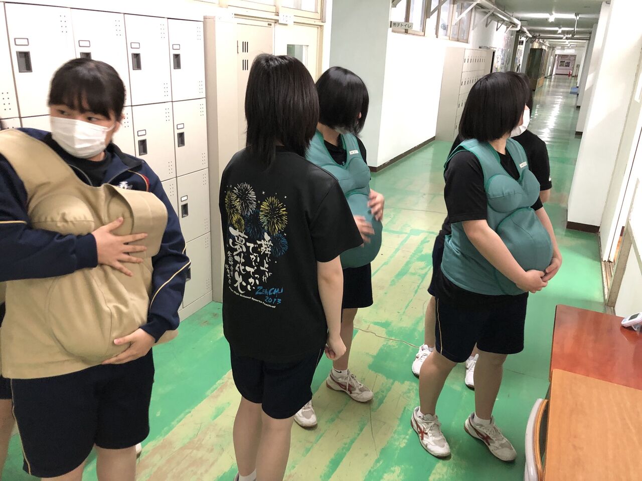 最初は男子=老眼化メガネで女子=妊婦体験重りだったのが男子も妊婦体験重りをしてた。