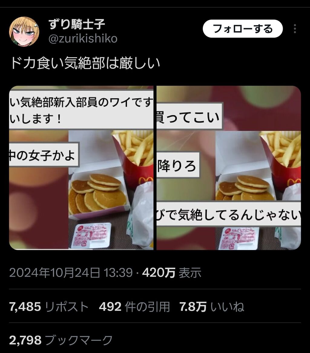 調べればすぐに分かることだが、初出の2020年の時点で既にTwitter上で活動してるドカ食い気絶部員はゴロゴロ居たat 2024年10月30日 18:53 ID:QcaH8nfl0