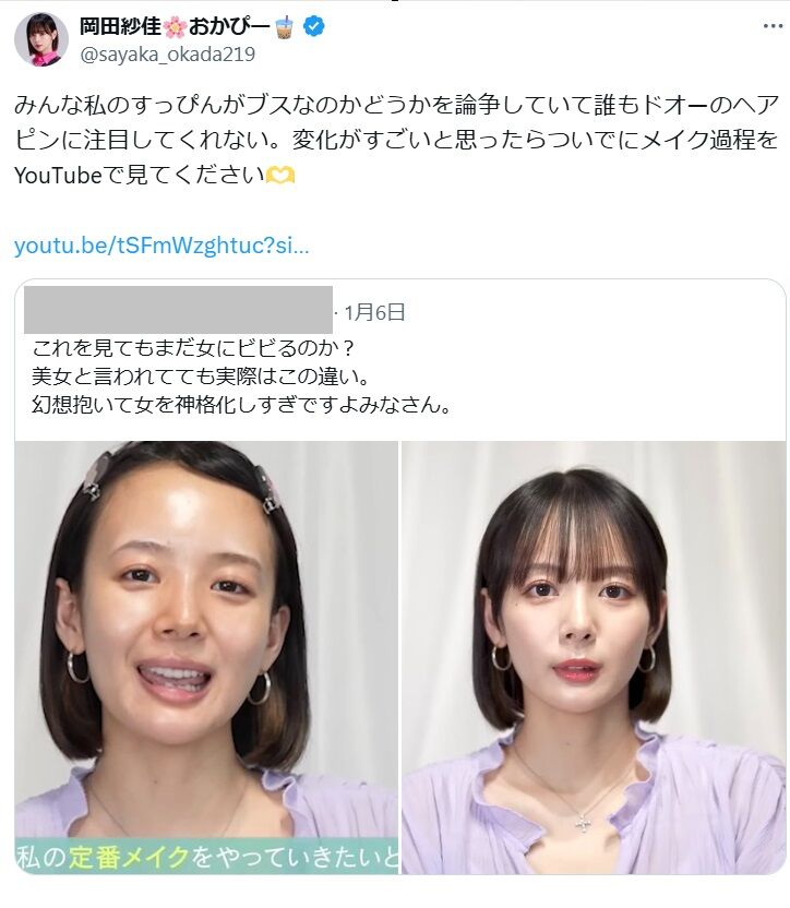 他と比べてどうとかじゃなくて、すっぴんとメイク後の差のこと言ってるんだろうよななし at 2025年01月11日 11:17 ID:et4HtHGT0 -