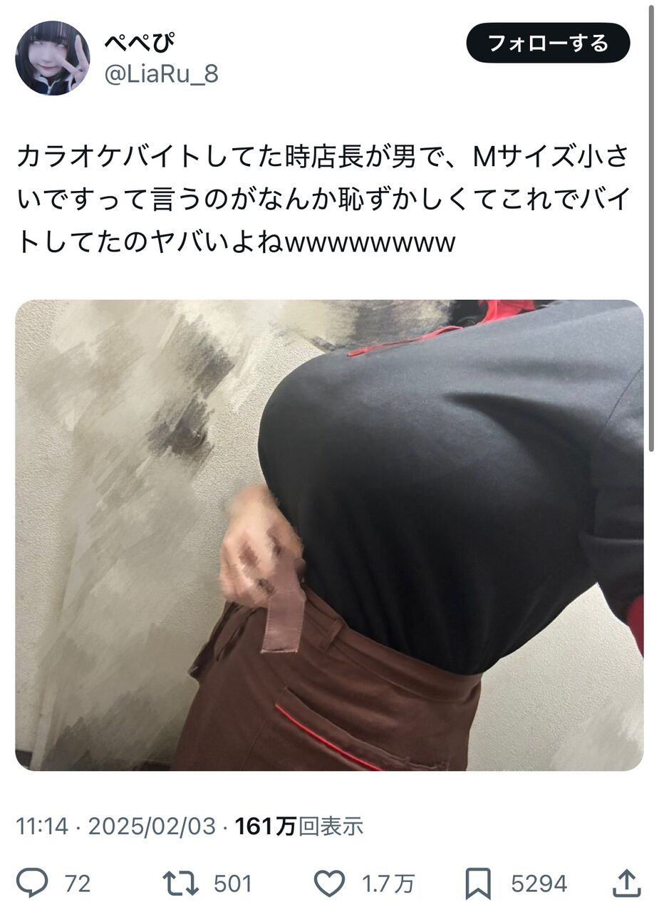 この格好で仕事するより店長にサイズ小さいですって言う方が恥ずかしいっての理解できんわもみあげる名無し at 2025年02月05日 14:56 ID:OAHpKf2c0