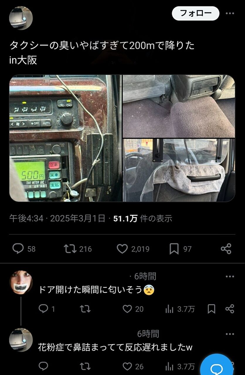 【画像】大阪のタクシー、めちゃくちゃ臭そう