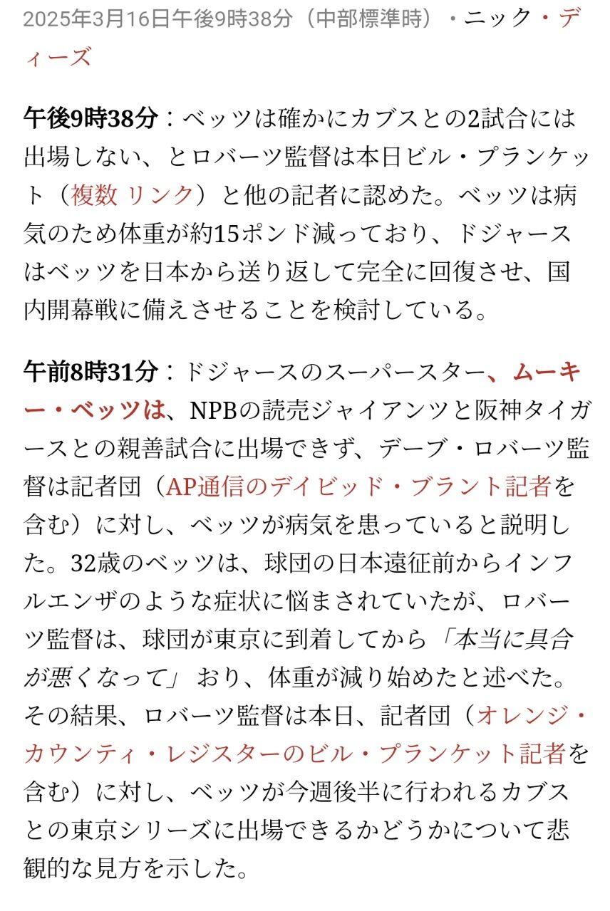 ベッツは春季キャンプの最終盤に体調不良を訴えた。カブスとの開幕2連戦を前に帰国し、欠場していた。この日に試合中にクラブハウスで取材に応じ、今朝は体調が回復していたが、試合前になって「吐き気がした」ことを明かした。体重は春季キャンプから11キロ減となる68キロに減少したと告白。「胃が本当に荒れているので、食べても吐いてしまう。食べるのが怖い」などと明かしていた。