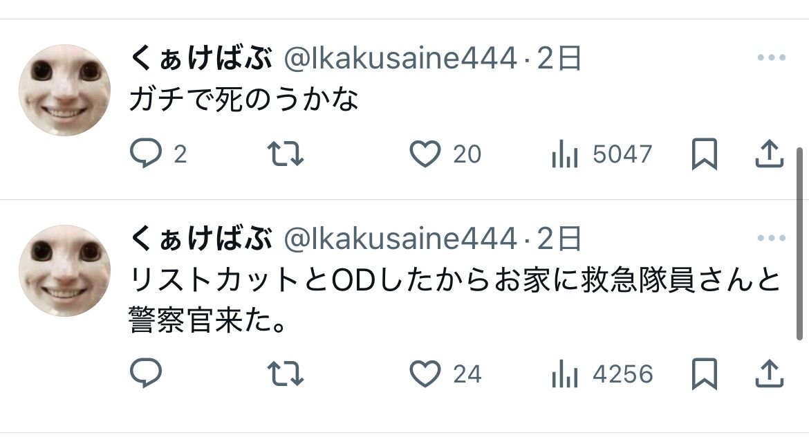 本気で死を選ぶならSNSになんて投稿しないで樹海へ行けばいいのにもみあげる名無し at 2025年05月31日 19:41 ID:RbogRGki0