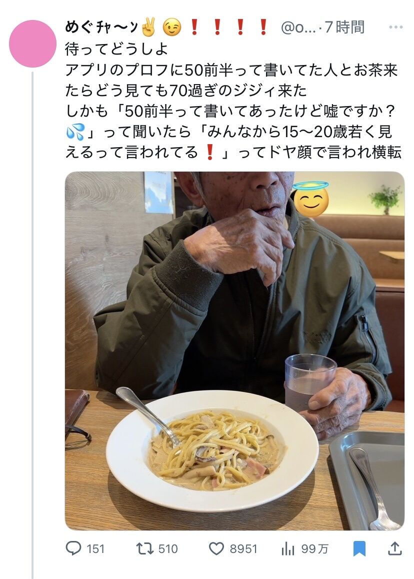 アプリのプロフに50前半って書いてた人とお茶来たらどう見ても70過ぎのジジィ来た