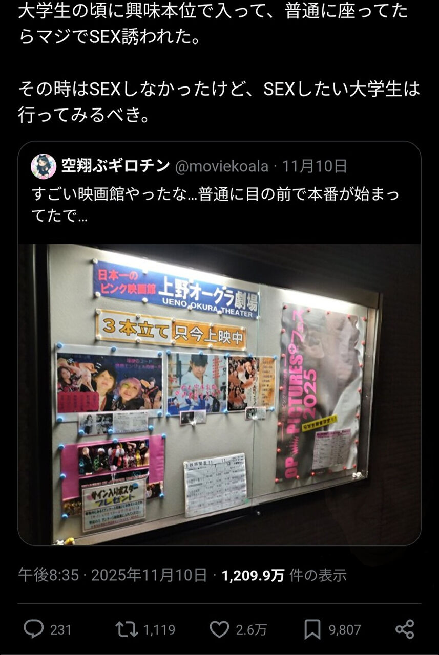 高校生の時に地元のポルノ映画館に興味で行ったらおっさんに太もも触られて逃げたことあるわもみあげる名無し at 2025年11月12日 19:45 ID:8MNn597o0 -