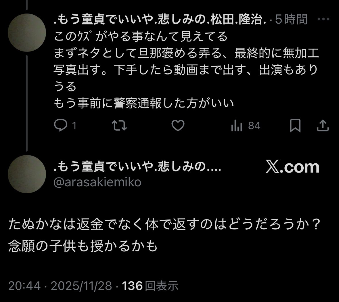 何で本人が「実は結婚してました」って言っただけでりりちゃんみたいな事して殺された女みたいな扱い受けてんだもみもみ名無し at 2025年11月30日 17:20 ID:RNzqXJk70 -
