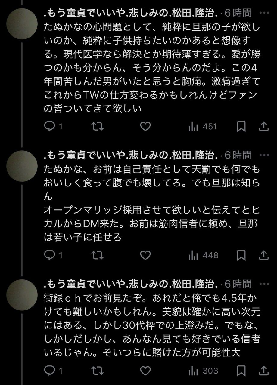 たぬかなの結婚発表以前より精神に異常をきたしていたと思うもみあげる名無し at 2025年11月30日 01:13 ID:J6kZ8HDR0 -