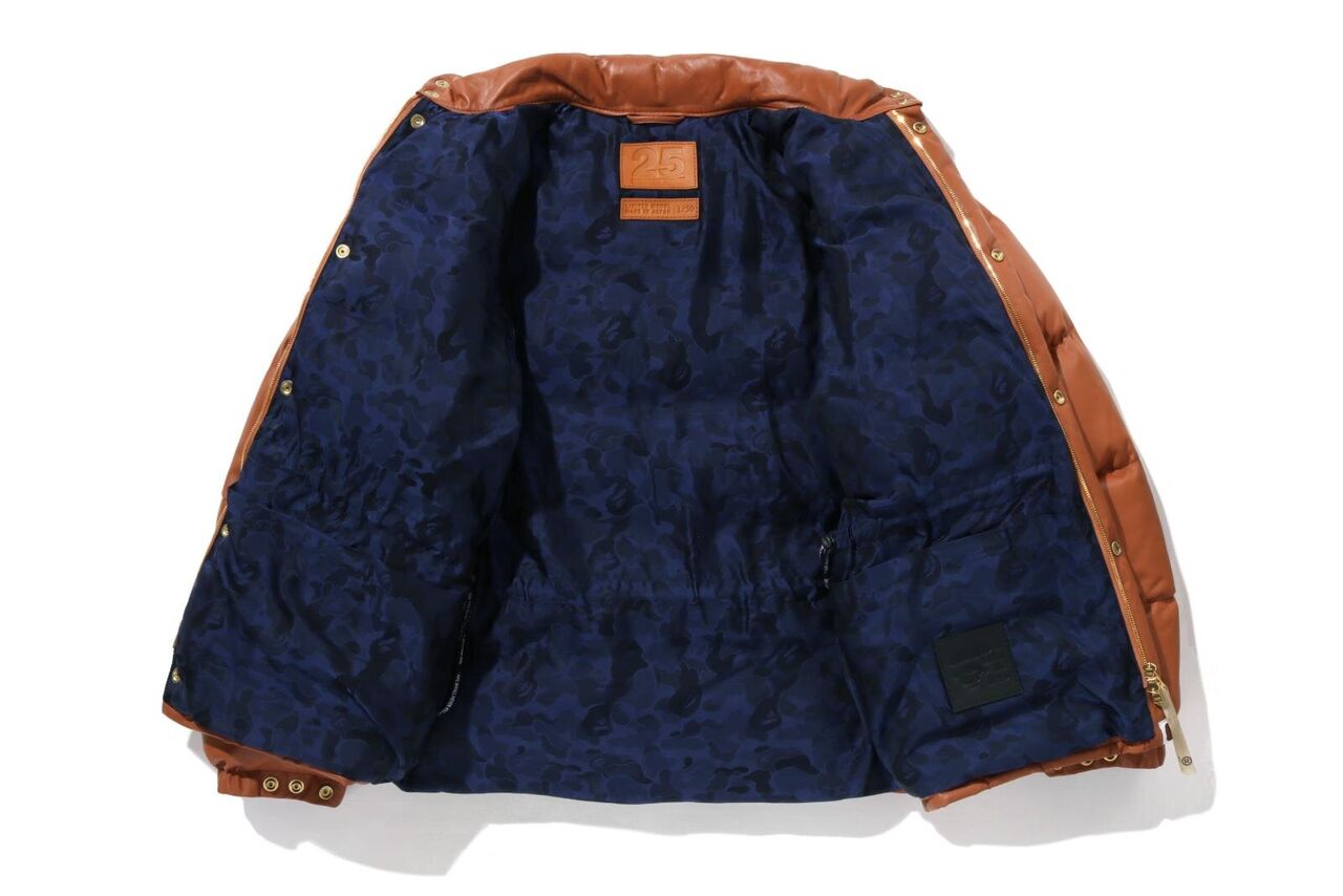 シグネチャーであるブラウンレザーは、特別に選び抜かれたシープスキンを採用し、柔らかさと耐久性を兼ね備えている。フロントにはゴールドのスナップボタンを配し、クラシックなシルエットに控えめな華やさを演出。内側にはジャカード織りで表現したネイビーの「ベイプR︎」カモライニングを採用し、細部にまでブランドの美学を刻んでいる。 さらに襟元には限定モデルであることを示す「25」の型押しレザーパッチと、一着ごとに異なるシリアルナンバーが刻まれ、特別なモデルであることを証明。付属するウッドハンガーにも「25」ロゴをあしラウなど、細部にまでこだわった仕上がり。