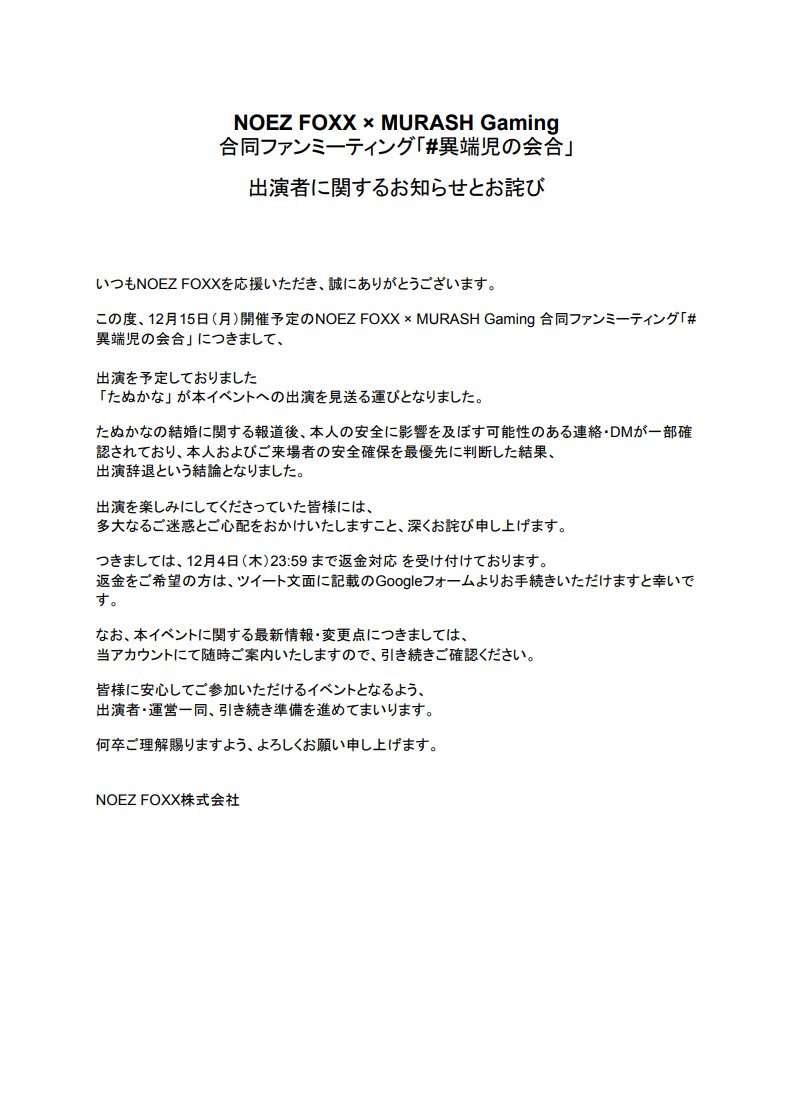 【NOEZ FOXX × MURASH Gaming 合同ファンミーティング「#異端児の会合」出演者に関するお知らせとお詫び】