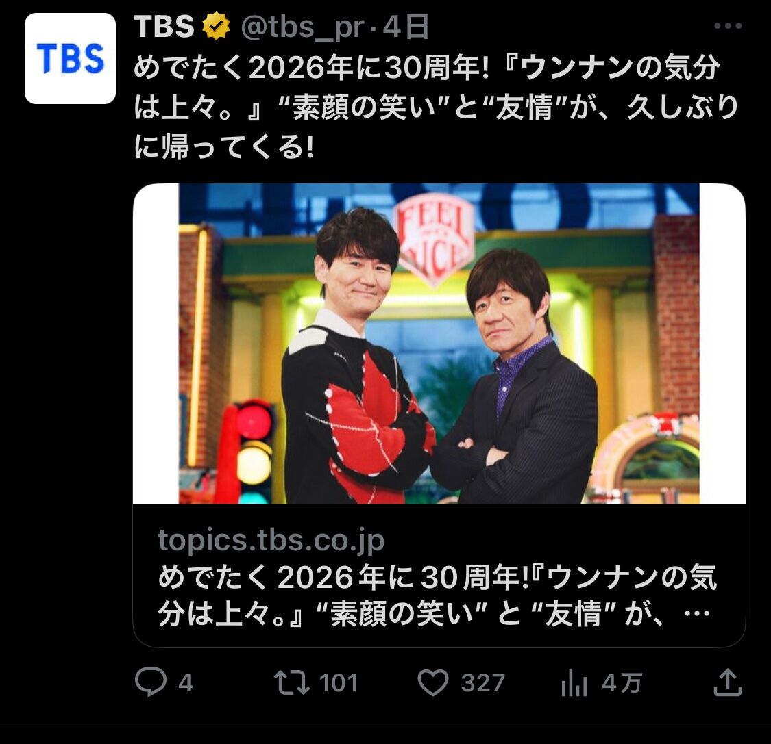 ウンナン一人もいないと炎のチャレンジャーじゃないし2人起用する予算も無いんだよat 2025年12月11日 09:05 ID:e7fJnREL0 -
