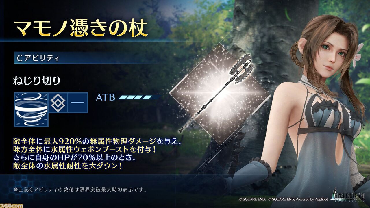 『ニーア』シリーズとのコラボガチャ第3弾となる今回は、エアリスの“マモノ憑きの杖”、セフィロスの“不死鳥の大太刀”がピックアップ。スタンプシートの報酬として、エアリス専用ウェア“マモノ憑きの衣服”、セフィロス専用ウェア“世界を滅ぼした男の衣服”が獲得できる。