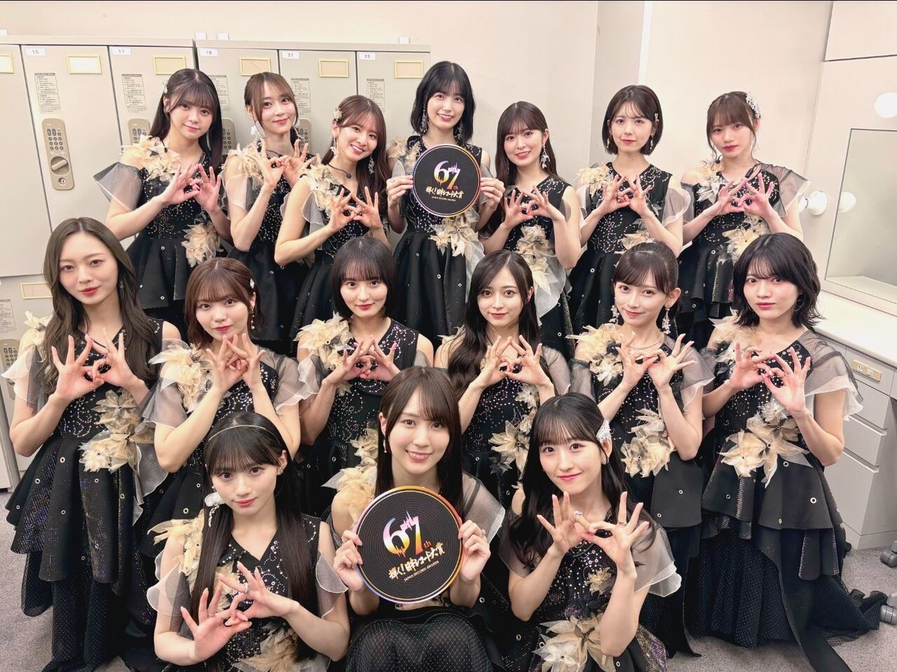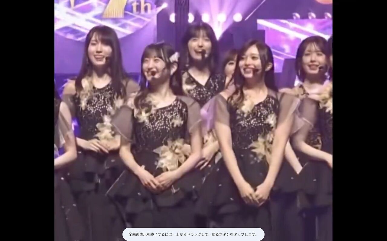 最後は一列目フロントメンバーも混ざって2列(前列後列)になってるんだが、賀喜が三列目に混ざって後列中央に入ったために、本来センターの五百城が画面右へスライド配置されてる